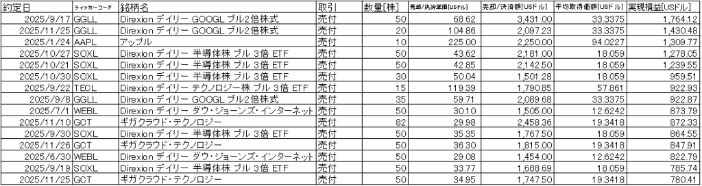SOXLをトランプ関税のあたりで少し追加で拾えて、安い買い単価で持てていること。WEBLを我慢して持てていること、ギガクラウドテクノロジーの値上がりが大きい。そして2025年の一番の成功はGGLL グーグルのブル2倍ETF。安値からは4倍近くになってる感じ。